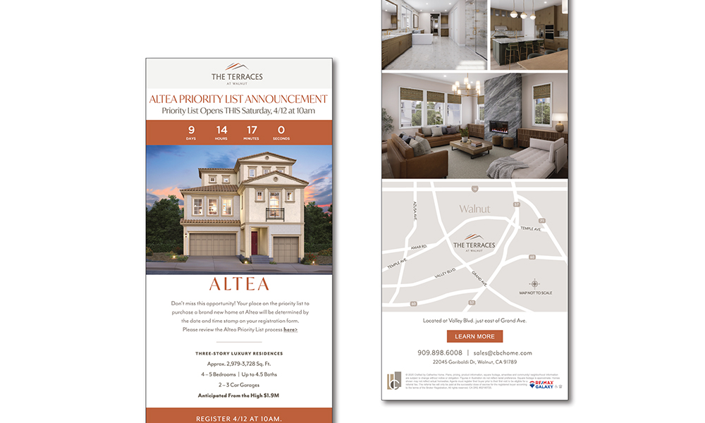 P11 is playing a crucial role in driving marketing initiatives for CBC Home and their new home community, The Terraces, located in Walnut, CA. Efforts began with target demographics and psychographic analysis, followed by a thorough brand strategy and market analysis. Currently, we are focused on the upcoming opening of their Altea neighborhood, which features new, single-family three-story homes. Our well-structured and strategic approach for Altea encompasses targeted email marketing campaigns, analytic evaluations, digital marketing, social media content creation and management, as well as advanced interactive tools designed to engage potential buyers both on-site and off-site. This integrated strategy aims to create renewed momentum and enthusiasm for this master-planned community, strategically located to attract homebuyers who prioritize quality education, picturesque surroundings, and convenient access to Los Angeles. The immediate positive response highlights P11’s proven ability to deliver optimal marketing outcomes in real-time.