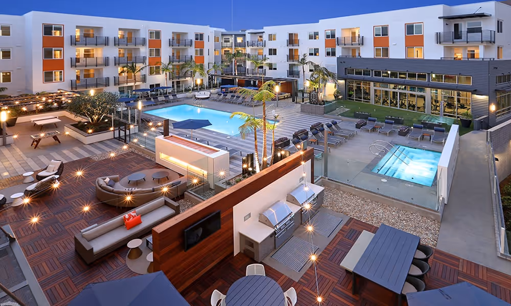 The RoyceAMENITIES OF NOTE: Resort-style pool with transparent glass edge spa and custom Aluma-Teak cabanas and stimulating game courtyard with a full bocce ball court, ping pong table, foosball table, and fire feature with an outdoor seating area.