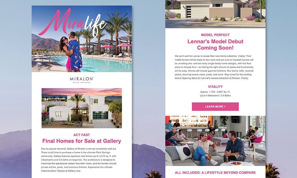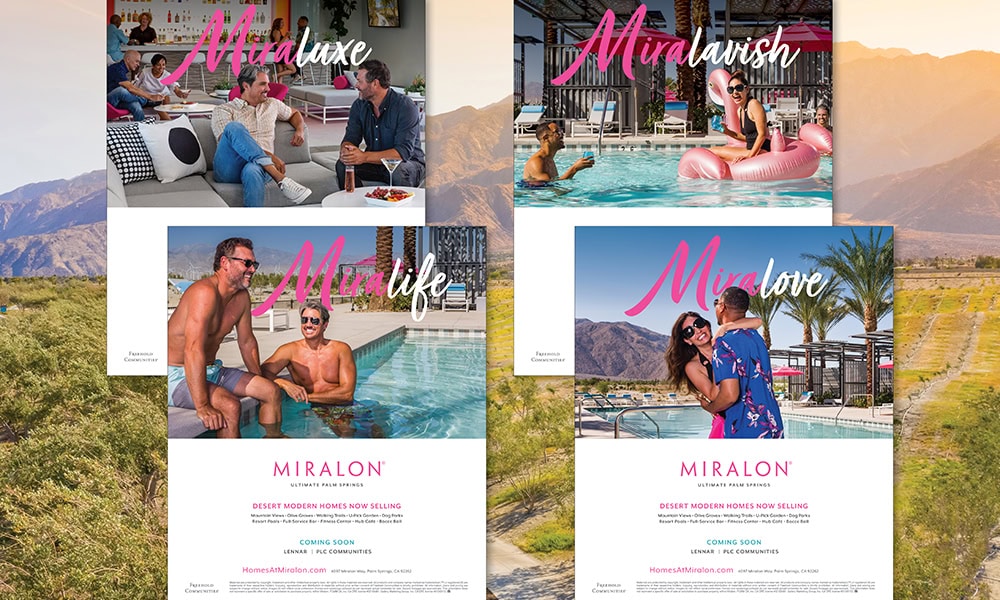 We’re happy to reveal a whole new and exciting creative campaign for Miralon—an existing, luxury master-planned community in Palm Springs, CA. And like its coveted location, the new campaign is colorful, fun, and fabulous! The inspiration for the new campaign is the Miralon name itself. We brought it to life in a clever way by adding a series of rotating “L” suffixes to identify the specific advantages that are innate at Miralon, which make it the ultimate place to call home in the Coachella Valley.EXAMPLES OF HOW WE TOOK THE MIRALON NAME AND CREATED AN EXPRESSIVE “L” CAMPAIGN FOR COMPLETE STORYTELLING.